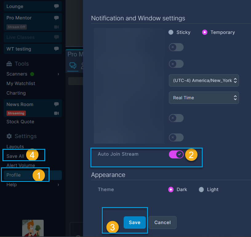 By default, Profile settings will automatically start the live stream when (if one is available) when you enter a room or whenever a new stream is started and you are already in the room. If you want to maintain control and manually initiate the live stream at your convenience, simply toggle off Auto Join Stream in your Profile Settings found in the bottom left under Profile.
