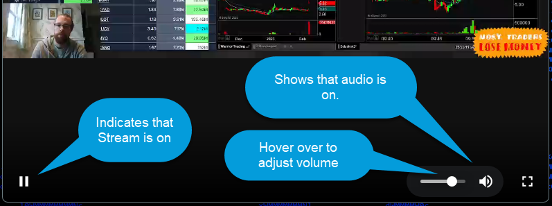 To adjust live stream audio in the live trading room, hover over the screenshare image, and you'll see a volume bar appear. You can then adjust the lever on the volume bar to turn the audio up or down. Clicking the speaker phone icon will mute or unmute audio. See the images below for the stream widget functions and volume adjustment: