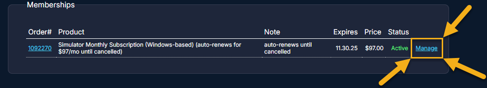 - Click Manage next to the membership you want to renew